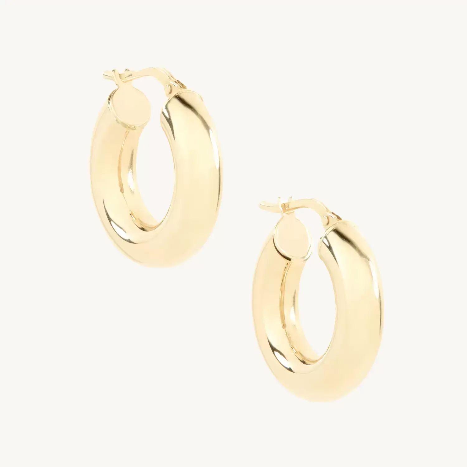A bold 14k gold tube hoop, to add gleam to your everyday! Lightweight and comfortable enough to be worn always. Securely closes with a pleasing click latch. These are your new favorites, pinky promise!