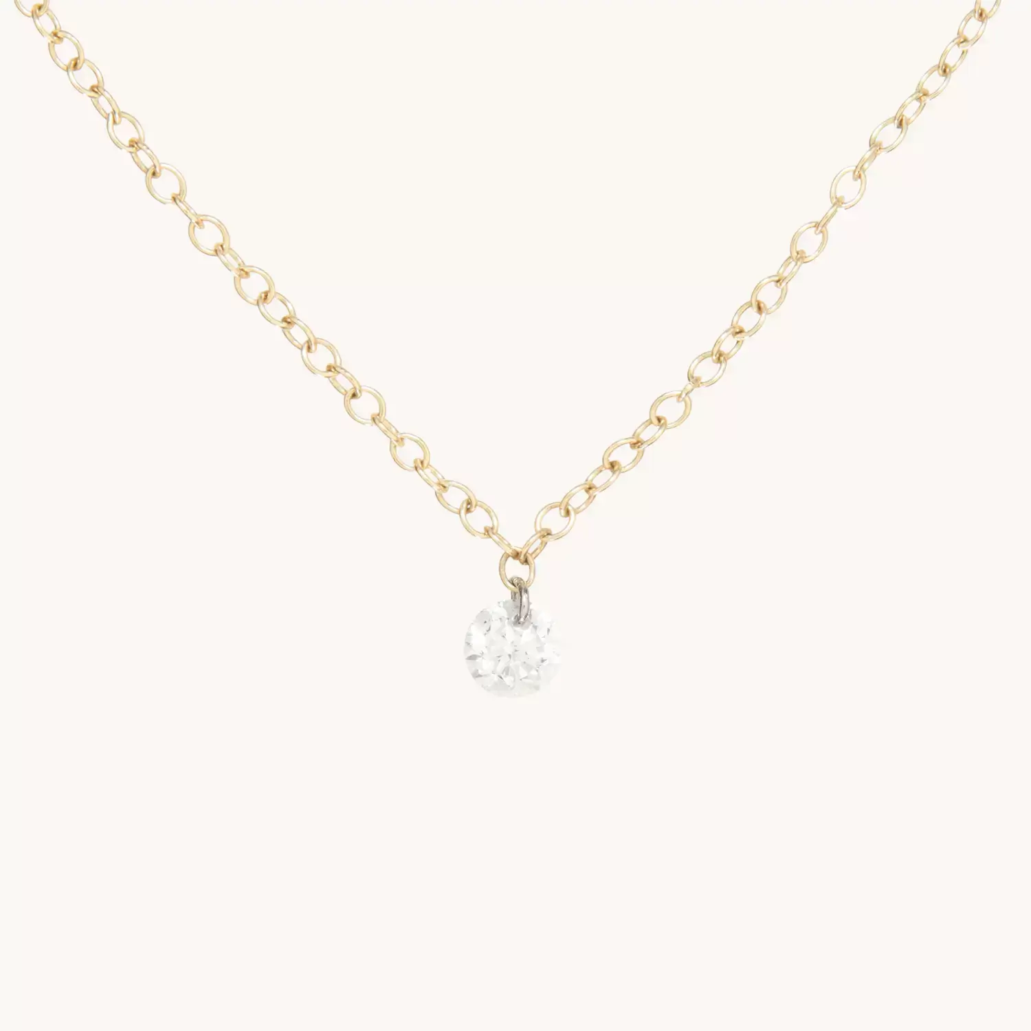 A shining diamond pricked through with a small shot of platinum, tethered to a fine gold chain.