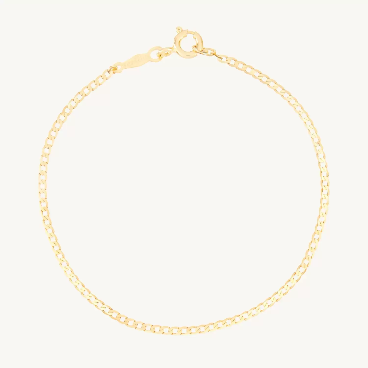 A gold bracelet as shiny and shimmering as a city avenue by day, by night. Looks effortless and cool worn on its own, or in a bracelet stack. A lightweight and semi-hollow chain that's exceedingly easy to wear. An airy, slinky cousin to a classic Cuban chain, made with 14k solid gold, for all the time wear.