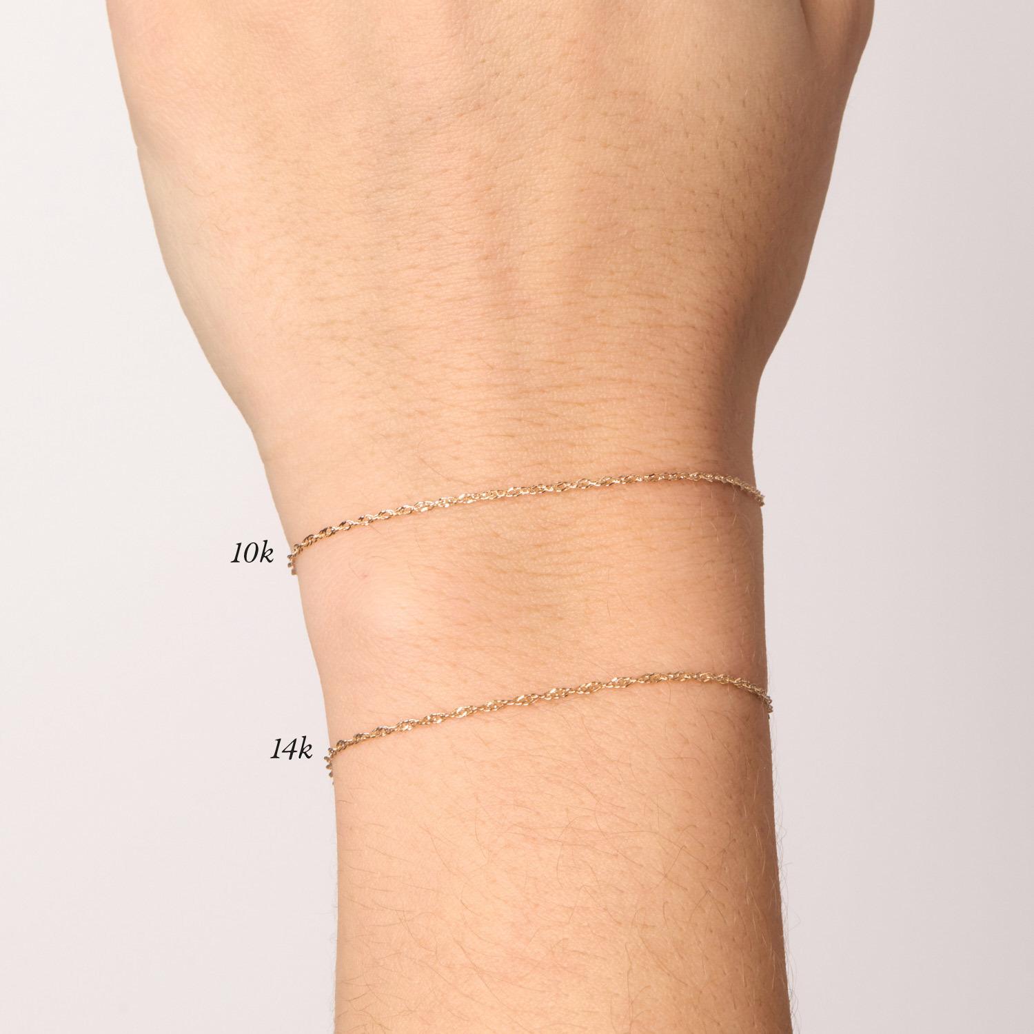 10k is slightly lighter in color, with added durability. 14k has a slightly richer hue and higher gold content. Both are solid gold, tarnish-resistant, gentle on sensitive skin, never plated, and meant for everyday wear, or as we like to say at Catbird: put it on, never take it off. Learn more about 10k and 14k gold here.